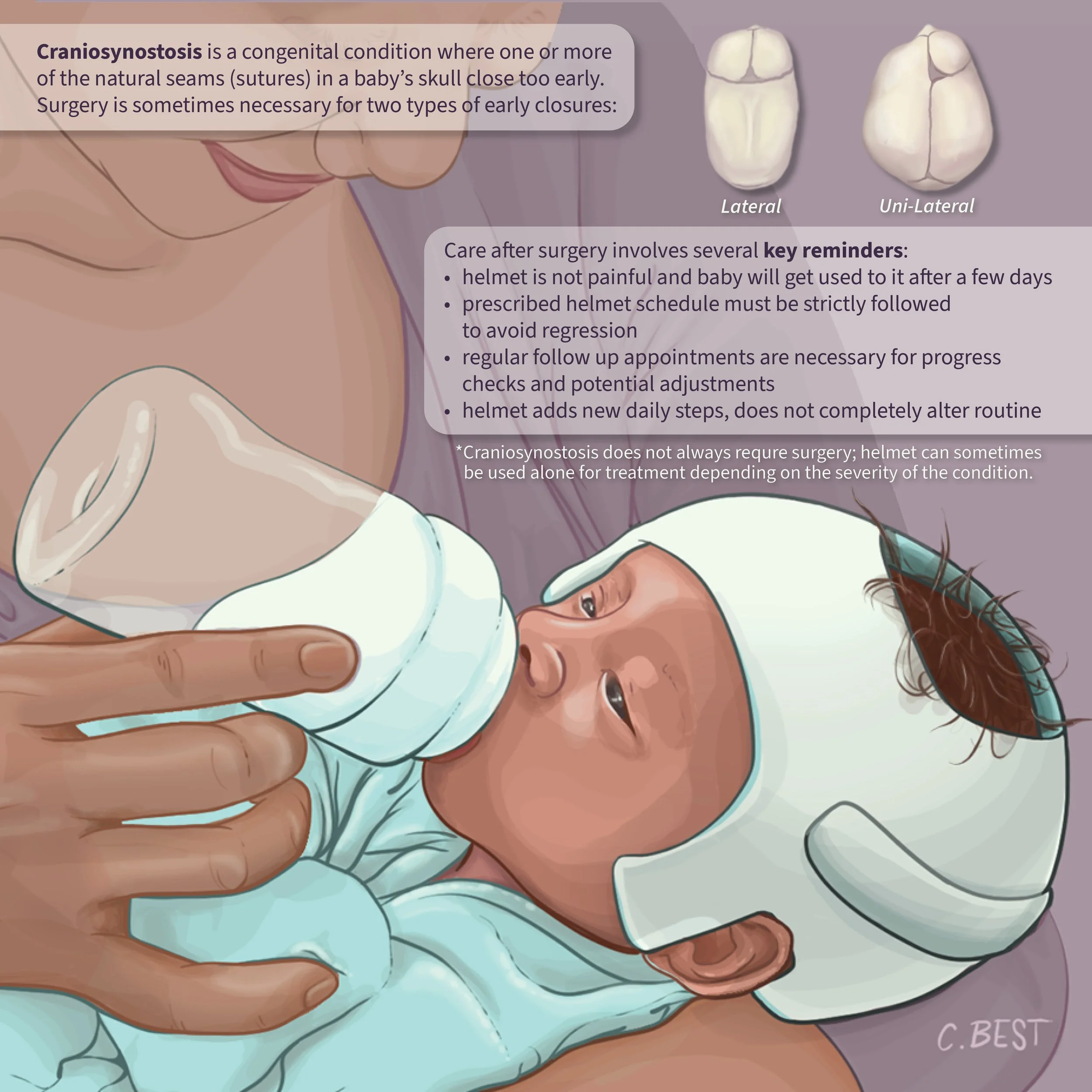 Instagram graphic for parents of newborns undergoing craniosynostosis surgery. Included information highlights post-operative care and daily routine. The illustrative depiction of a mother feeding her child post surgery is meant to calm parents and showcase normalcy in everyday life.