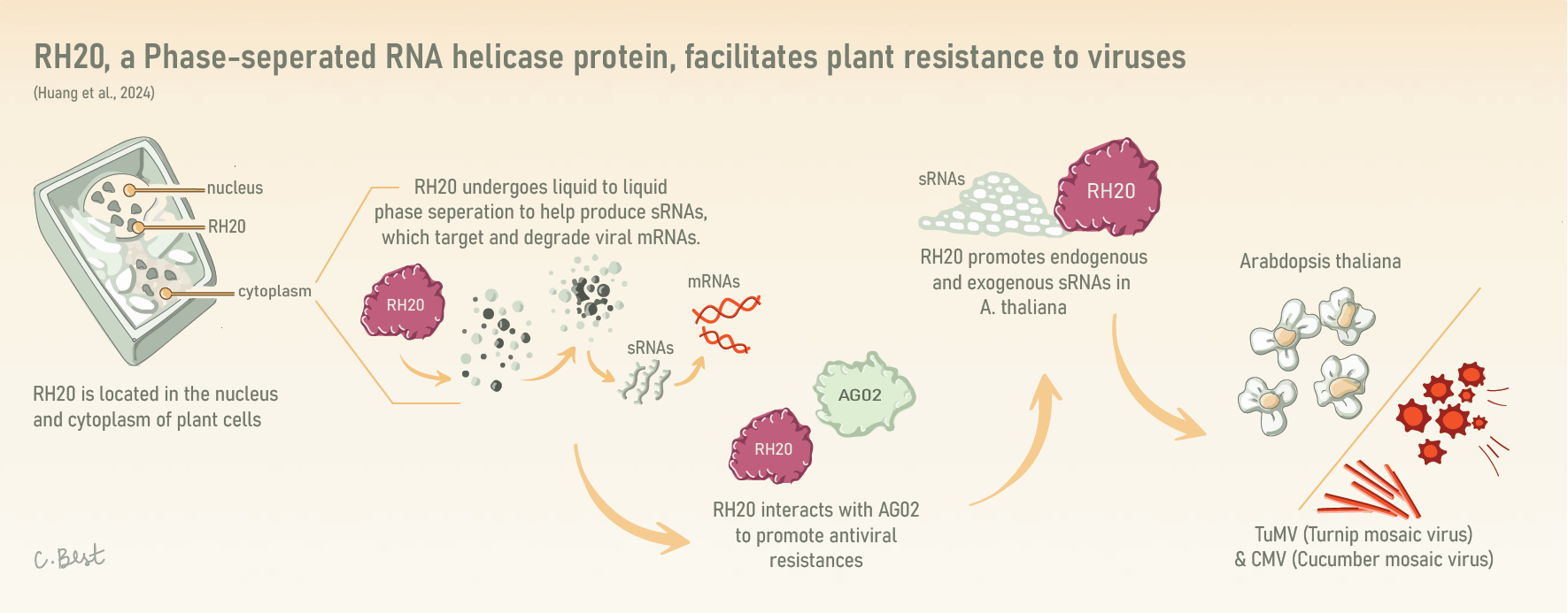 Infographic‑style visualization mapping RH20’s antiviral pathway in plants using clear sequencing and bold graphics to translate complex molecular interactions into an accessible narrative for a general audience.