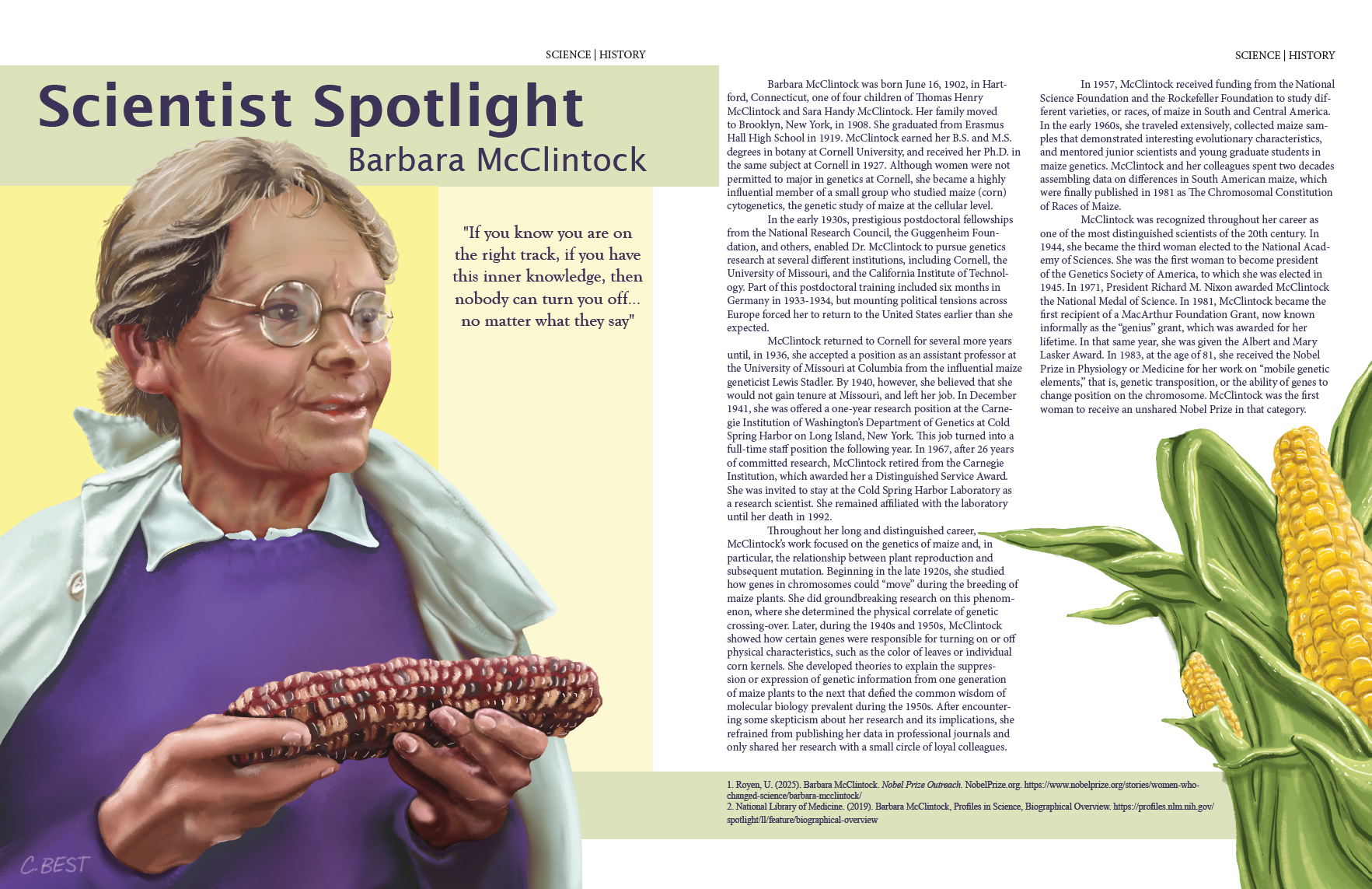 Editorial spread celebrating geneticist Barbara McClintock combining portraiture, historical narrative, and symbolic visual elements to build a compelling character spotlight. Designed to guide general audience attention through intentional composition, storytelling design, and a cohesive visual identity.