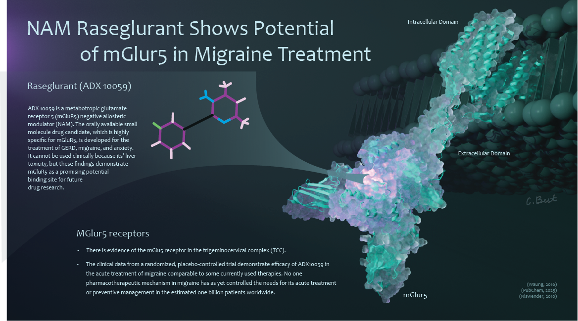 3D modeled conceptual visualization of mGluR5‑targeted migraine therapy using layered molecular imagery and clear narrative flow to translate complex pharmacology into an accessible, meaningful graphic for science professionals.