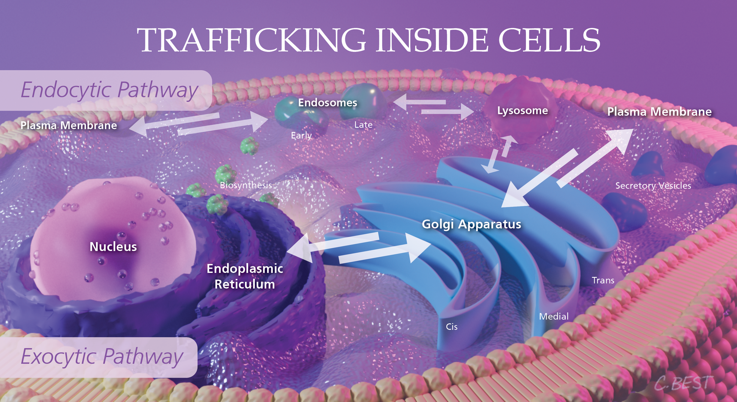A 3D didactic illustration designed for student audience to clarify the complex process of cell trafficking systems through 3D modeled structures, visual design hierarchy, and controlled lighting. The piece uses form, motion cues, and composition to guide viewers' eyes, balancing scientific accuracy with accessible and narrative visual communication.